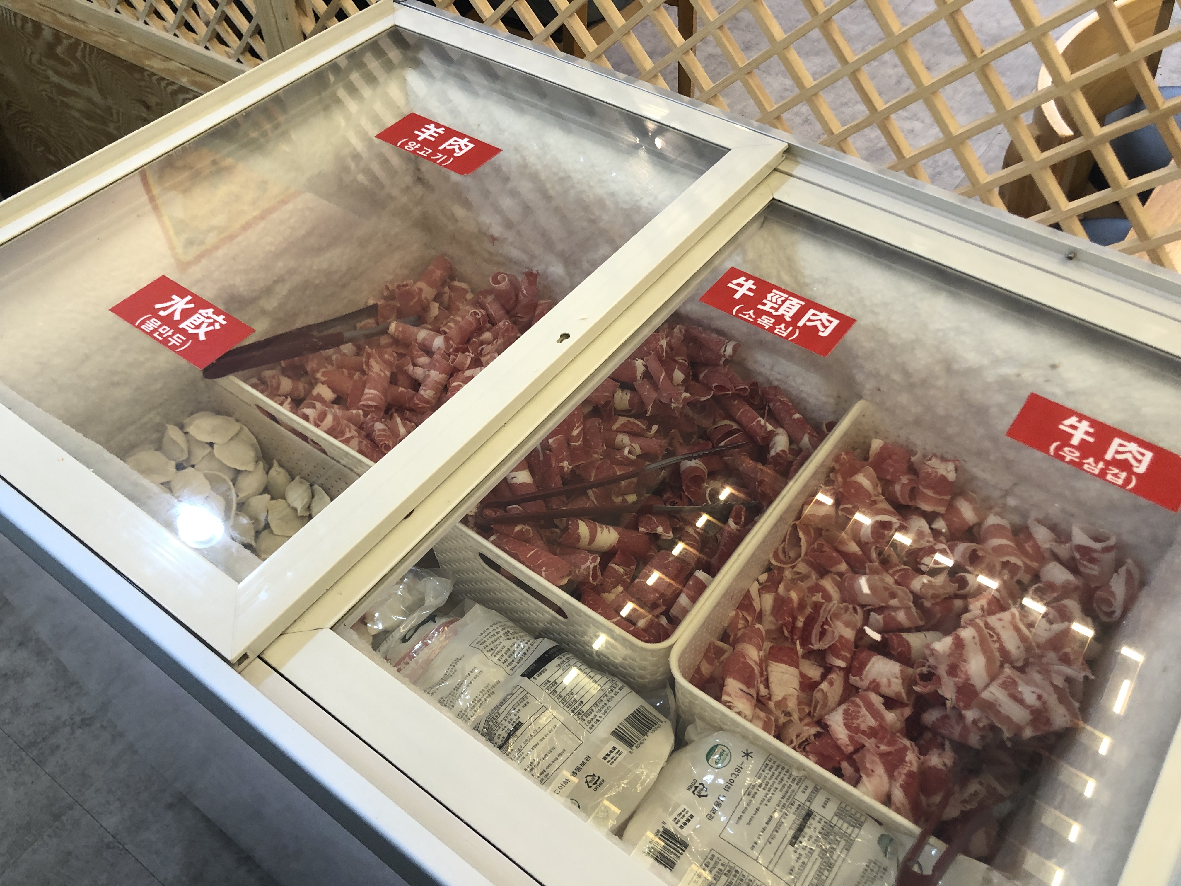 고기는 양고기, 물만두, 소목심, 우삼겹이 있어요.
