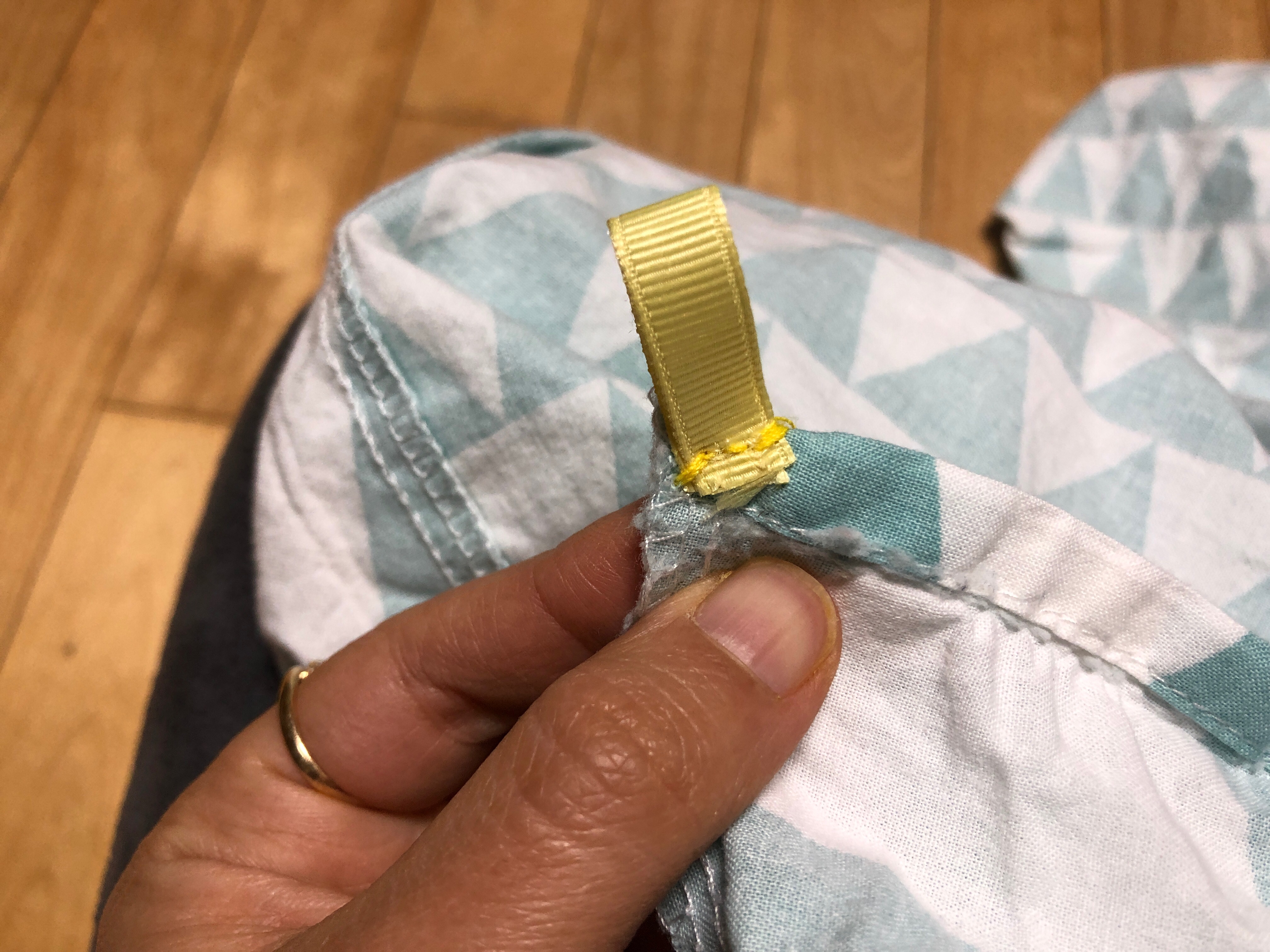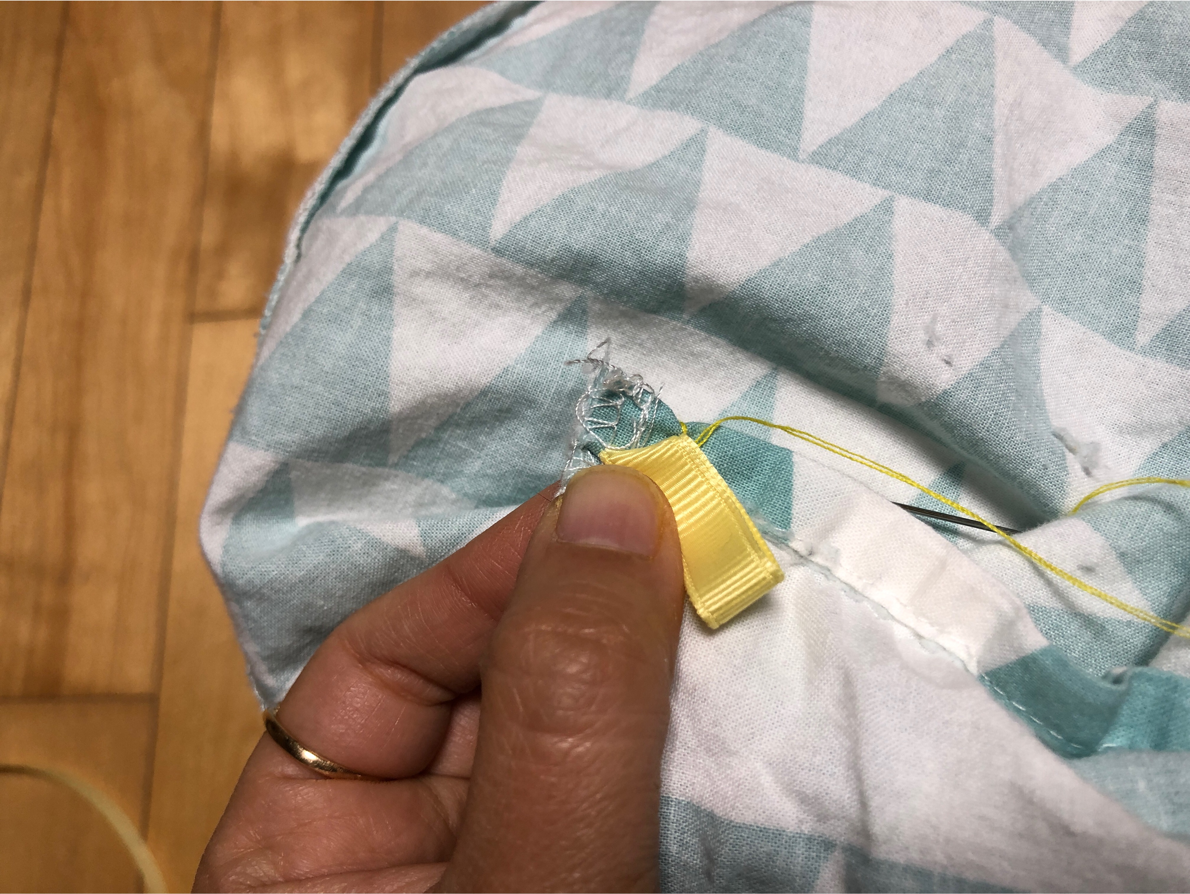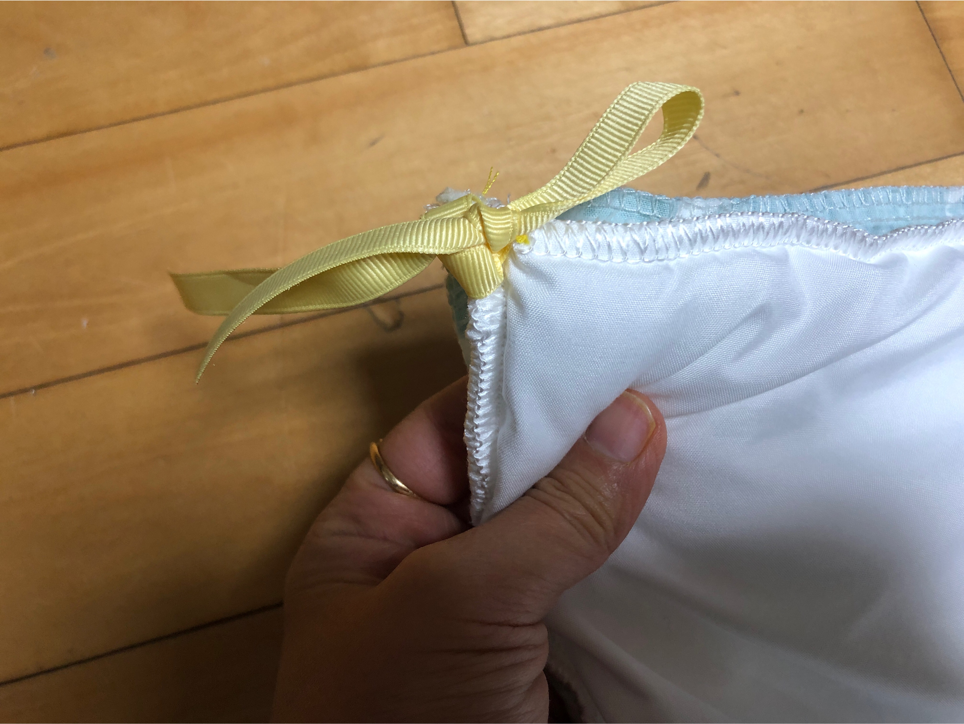 겉 이불 커버는 뒤집어서 펼쳐놓고 똑같이 같은 면, 네 모서리에 짧은 리본끈으로 고리를 만들어 줄거예요.