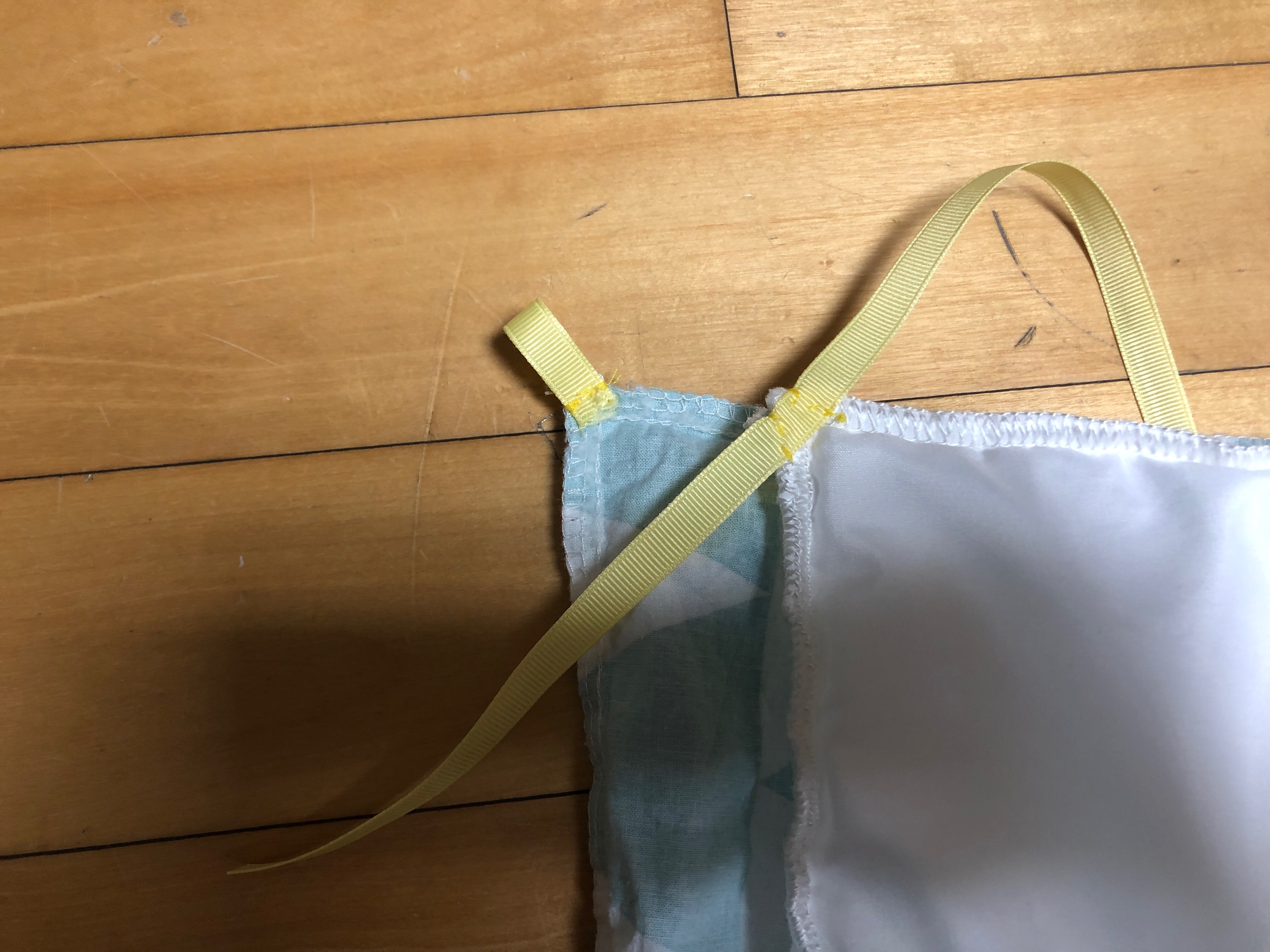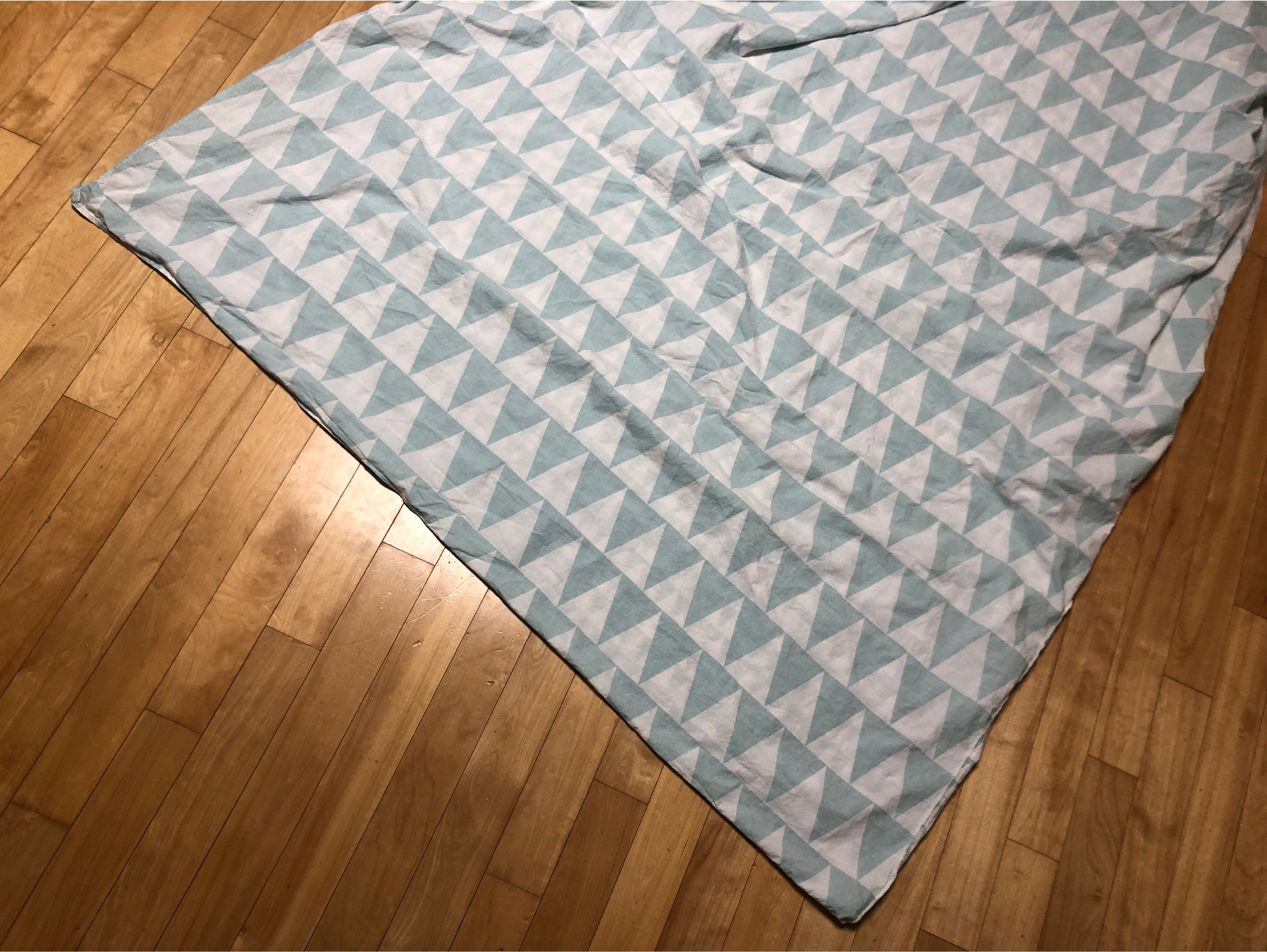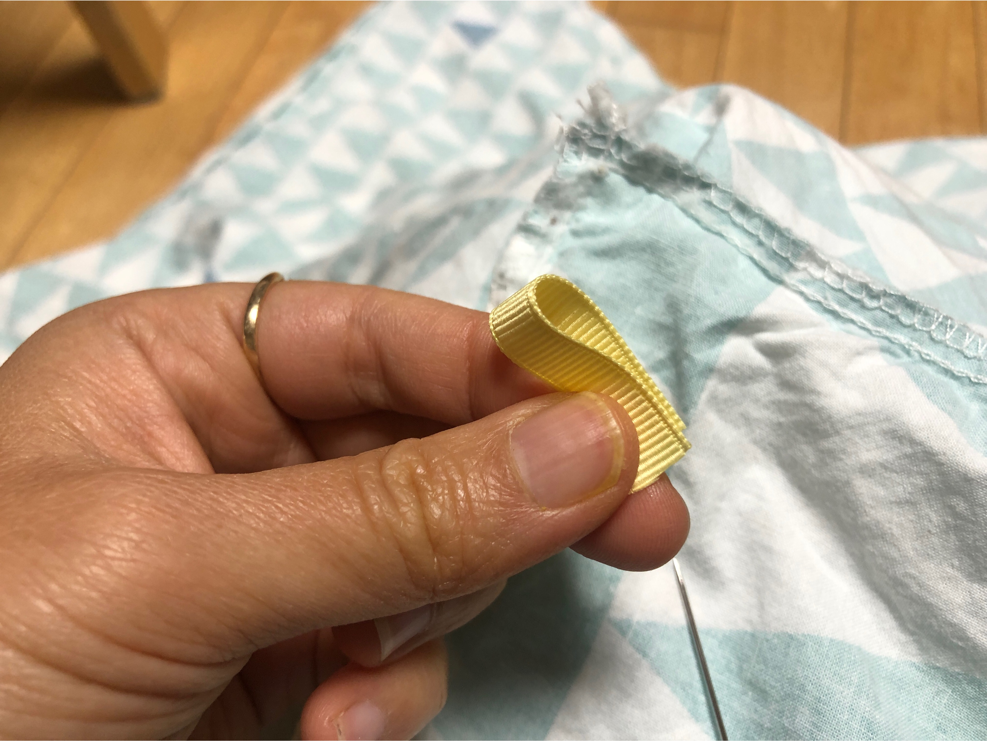 겉 이불 커버는 뒤집어서 펼쳐놓고 똑같이 같은 면, 네 모서리에 짧은 리본끈으로 고리를 만들어 줄거예요.