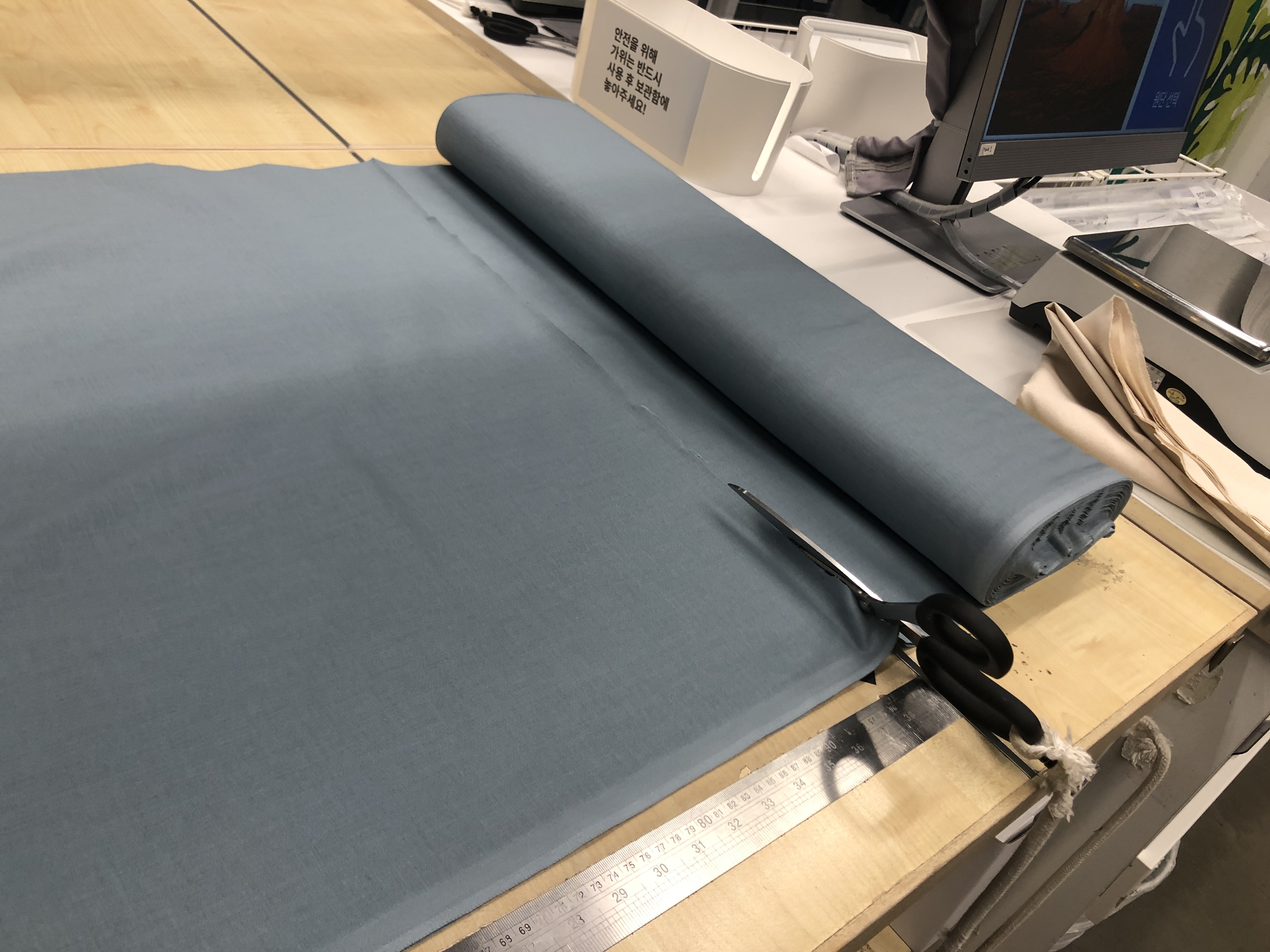 원단을 선반에서 직접 고른다음, 원하는 길이만큼 잘라 오른쪽 저울에서 원단선택 후 무게를 달고 라벨을 받아가면 됩니다.