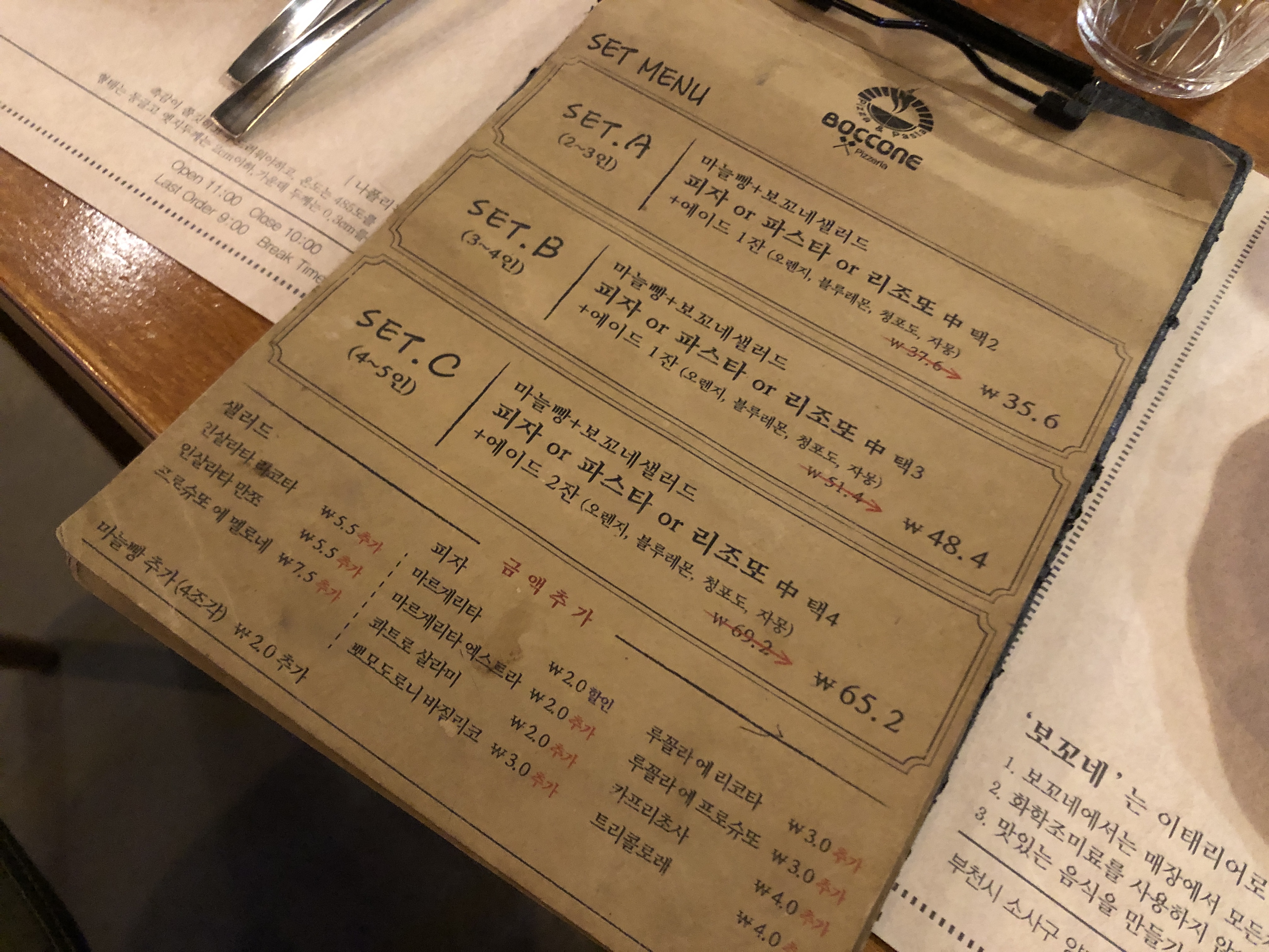 세트메뉴에는 마늘빵과 보꼬네 샐러드, 피자와 파스타 리조또 중 메인메뉴를 3개를 선택할 수 있고,