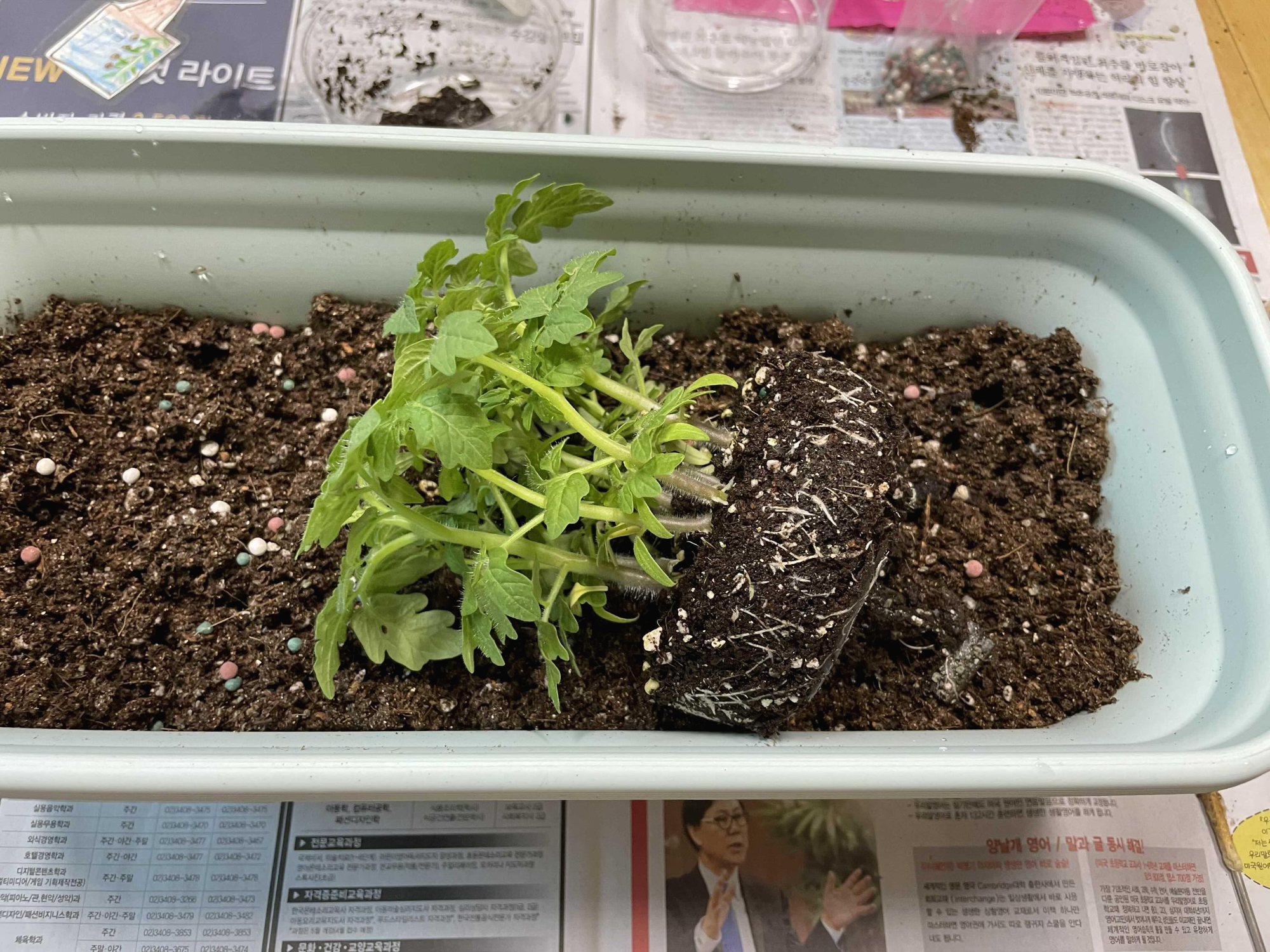 그리고 작은 화분에서 방울토마토를 빼낸 후에, 살살 뿌리가 다치지 않도록 분리시켰어요.