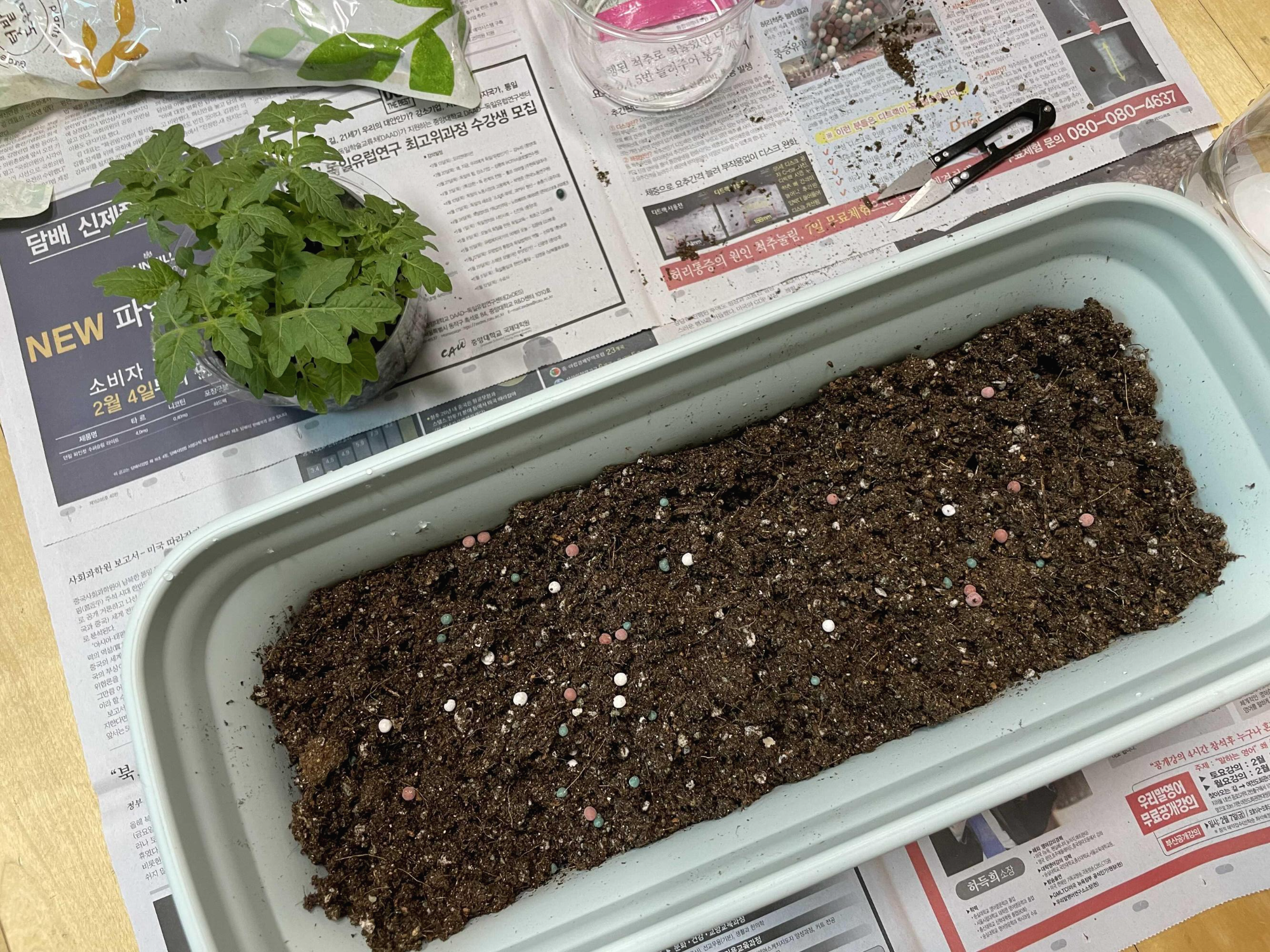 흙을 일단 화분에 반쯤 채우고 물을 미리 줬던 거 같아요.