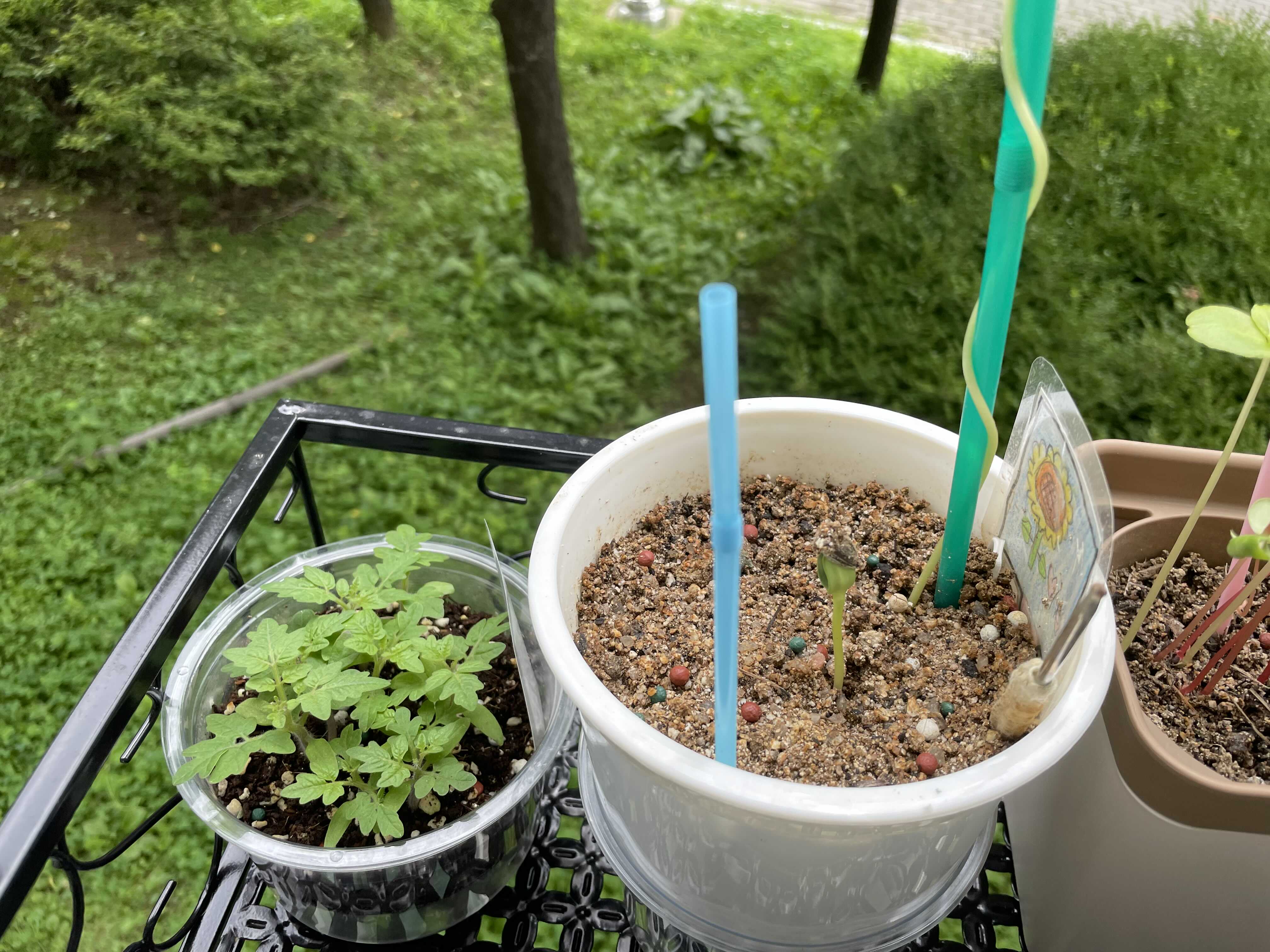 새싹 수준의 줄기 10개정도의 방울토마토와 우리집 비실이 해바라기,