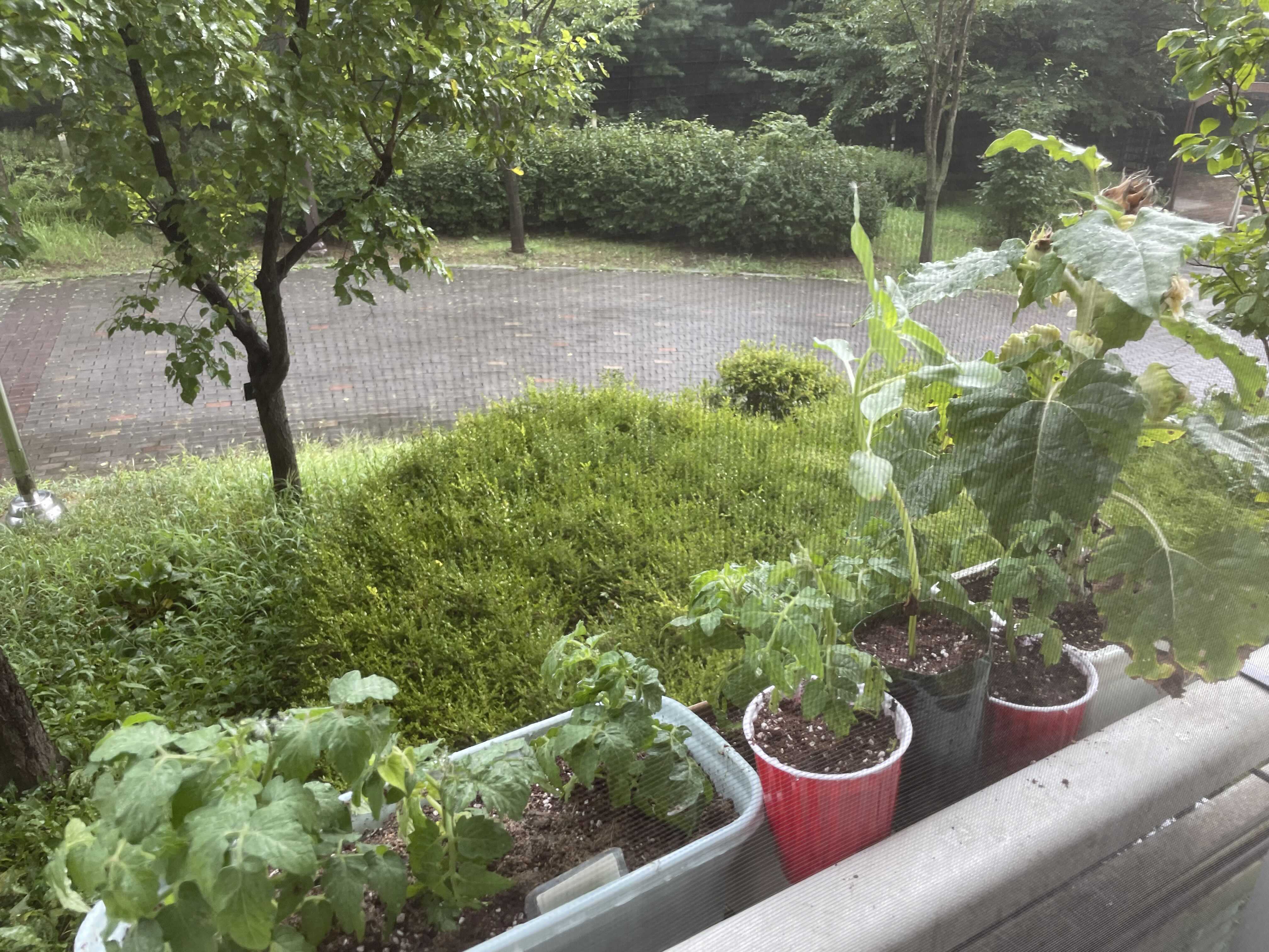 방충망 너머로 보이는 우리 토마토와 해바라기