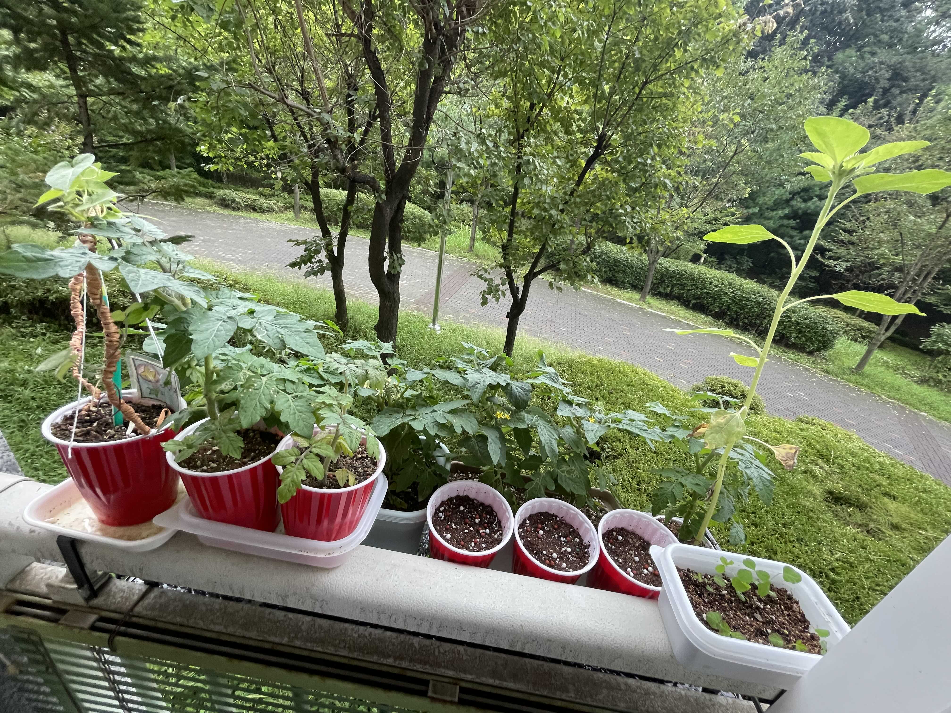 낮에도 한번 가서 흙이 말랐나 안말랐나, 방충망 열고 확인도 한번 하고, 곁순도 따주고 있구요.