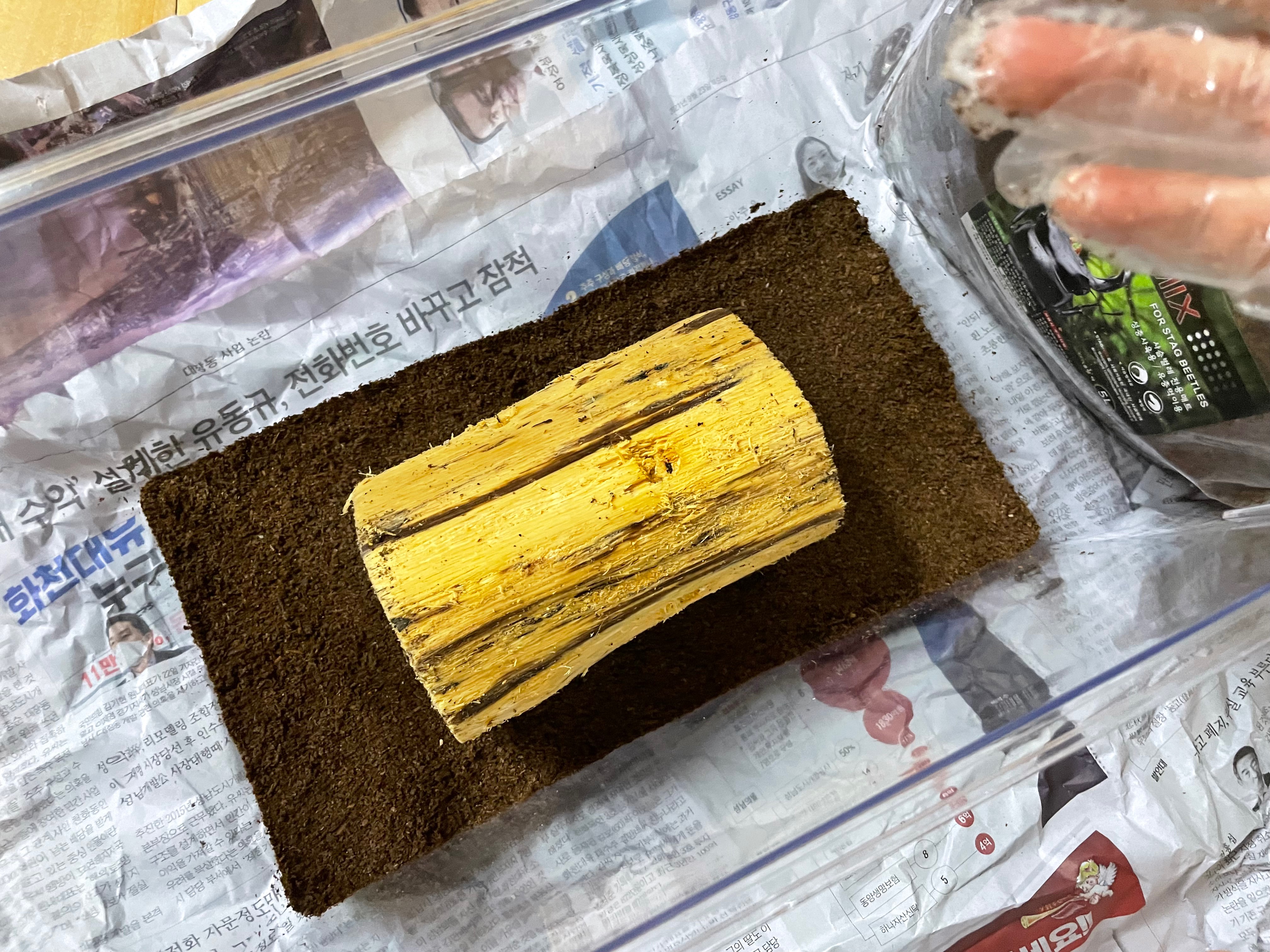 사육장에 사슴벌레매트를 약간 깔아놓고 꾹꾹 눌러줍니다.