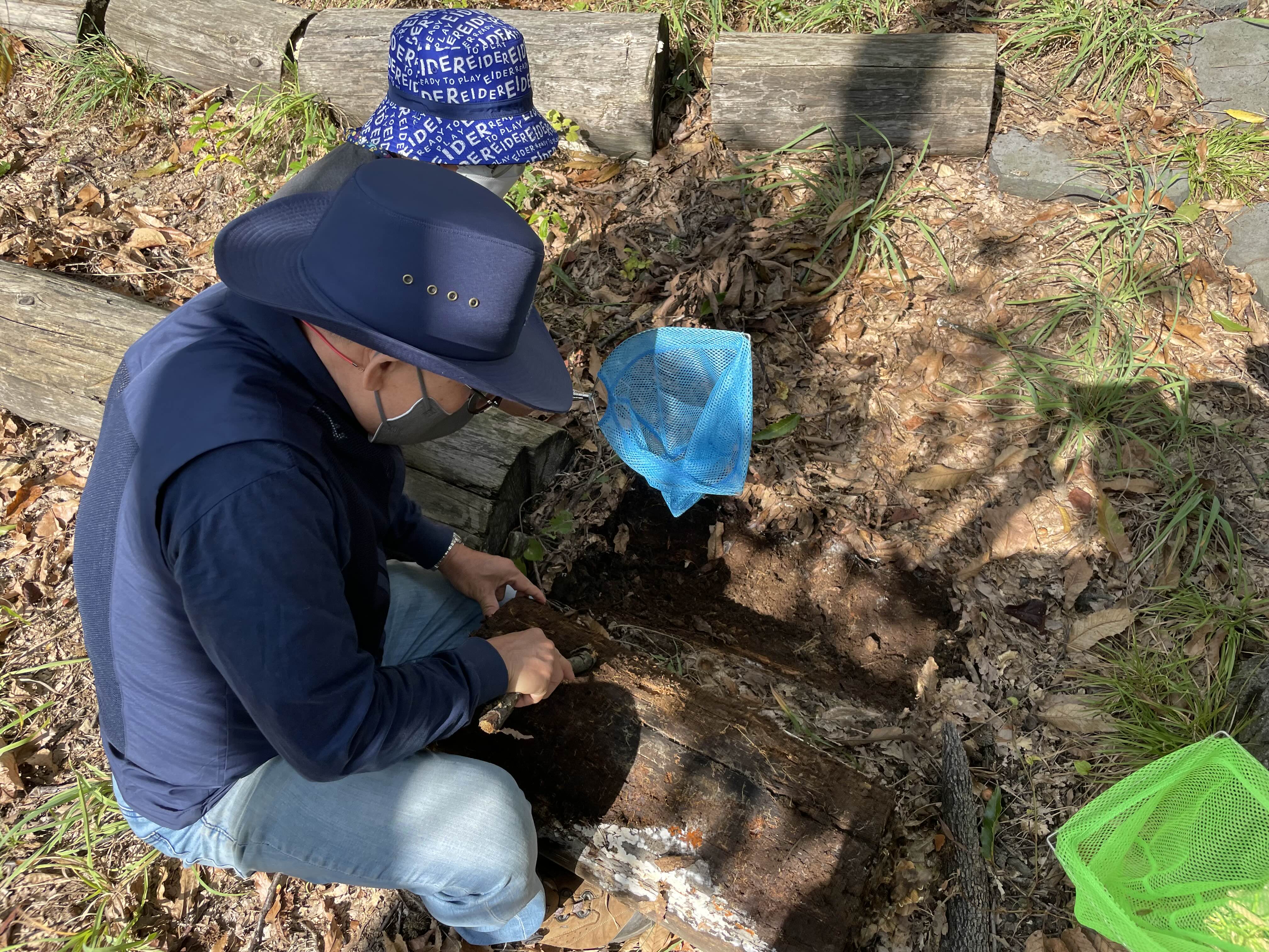근데 선생님께서 잘라놓은 나무 밑부분을 갈라서 사슴벌레를 두마리나 찾아주셨어요.