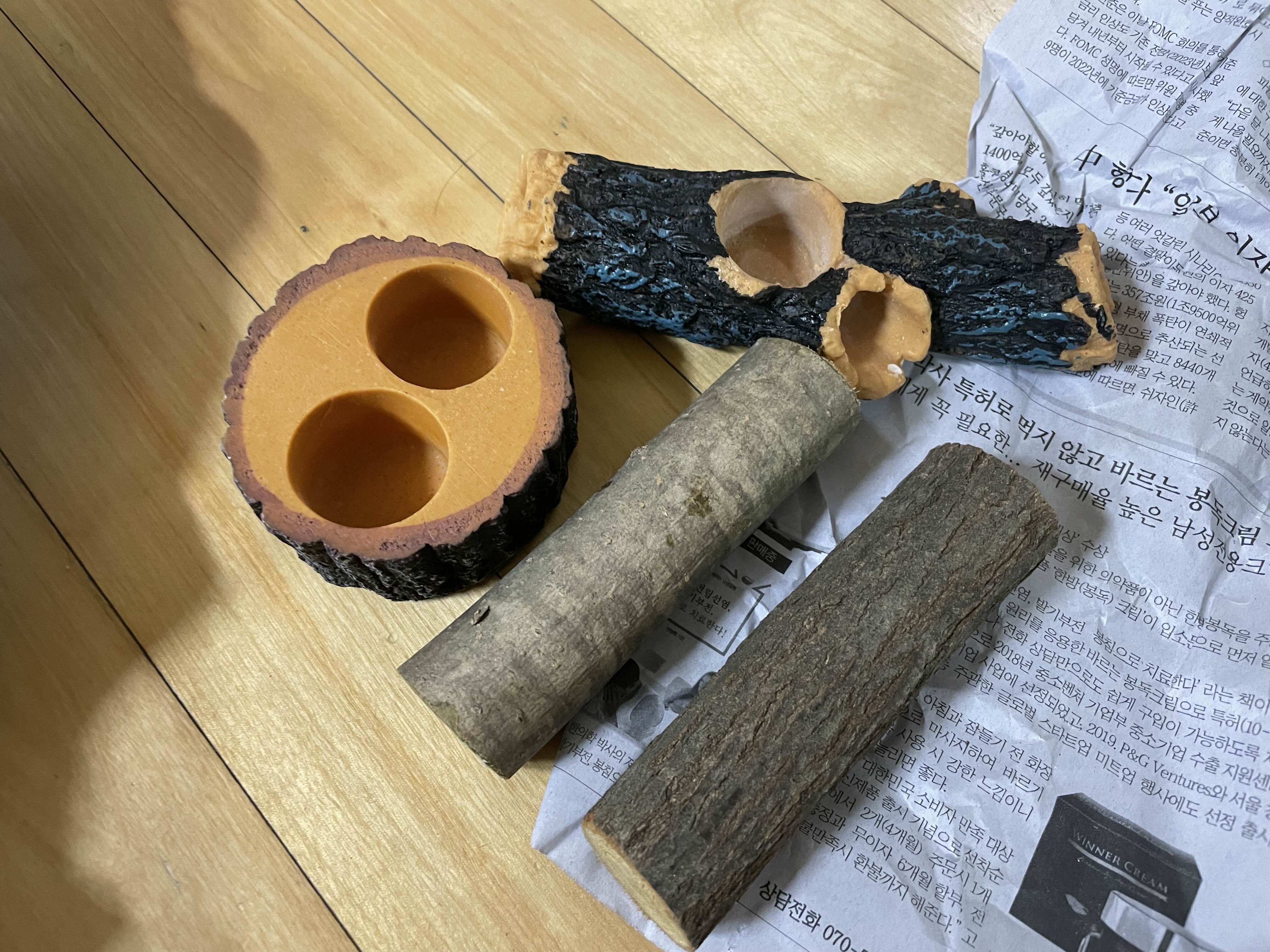 놀이목 두개는 진짜 나무로 준비했는데... 역시나.. 몇일 지나니 흰곰팡이가 위에 앉더라구요..